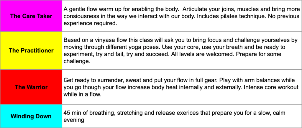 Their main mantra for yoga practice is: use your breath, use your core and listen to your body. The classes are developed in such a way that brings students’ awareness back to those 3 notions and allows students from various backgrounds to attend the classes by offering alternatives to poses and flows.